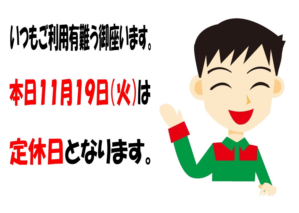 本日定休日となります。 ポスト 2019年11月19日 いつもお世話になっております。 本日11月19日(火)は定休日となります。 ご迷惑をお掛けいたします。 尚、20日(水)は10:00~18:30通常営業いたします。 よろしくお願い致します。 担当:ナルサカ