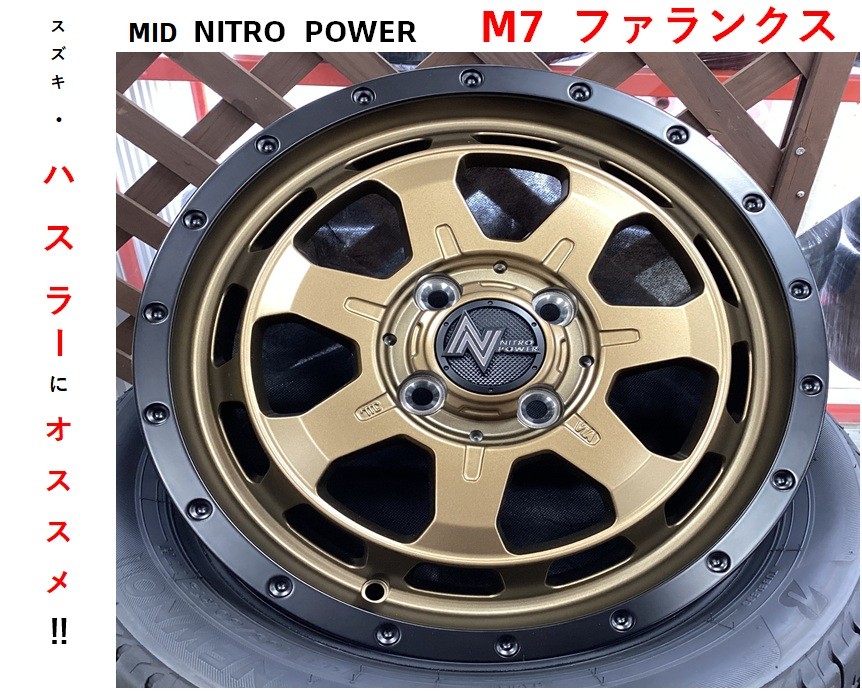 皆様こんにちは! タイヤ館湘南台です!! 本日は、新しい商品を入荷致しましたのでご紹介♪ それがこちら! ホイールメーカーMIDさんの商品 NITRO POWER(ナイトロパワー)の新商品 M7 ファランクス の マッドブロンズ!! サイズは、16X45 4/100 45 です! マッドブロンズですので 光の当たり方や...