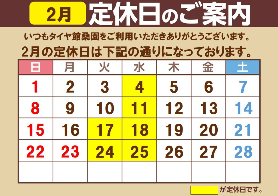 【お知らせ】2月の定休日のお知らせです❣ 2026年1月15日 いつもタイヤ館桑園店をご利用頂き 誠にありがとうございます! 2月の定休日のお知らせです! 2月は毎週水曜日と 17日(火)・24日(火)が 休業日でございます。 2月は例年冷え込みが厳しく、 積雪も増え、路面状況の悪化が見込まれます。 ナットの増し締めや空気圧点検も 定期的に実施しましょう! 皆様のご来店をお待ちしております♪