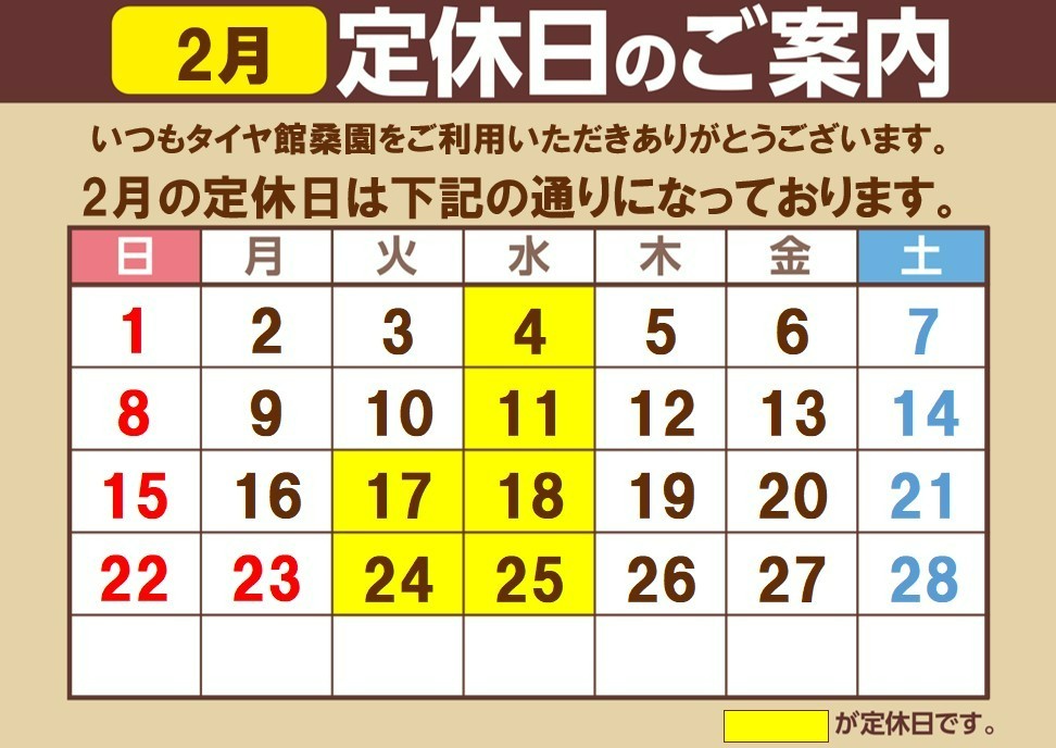 2月の定休日のお知らせです❣ 2026年1月16日 いつもタイヤ館桑園店をご利用頂き 誠にありがとうございます! 2月の定休日のお知らせです! 2月は毎週水曜日と 17日(火)・24日(火)が 休業日でございます。 2月は例年冷え込みが厳しく、 積雪も増え、路面状況の悪化が見込まれます。 ナットの増し締めや空気圧点検も 定期的に実施しましょう! 皆様のご来店をお待ちしております♪