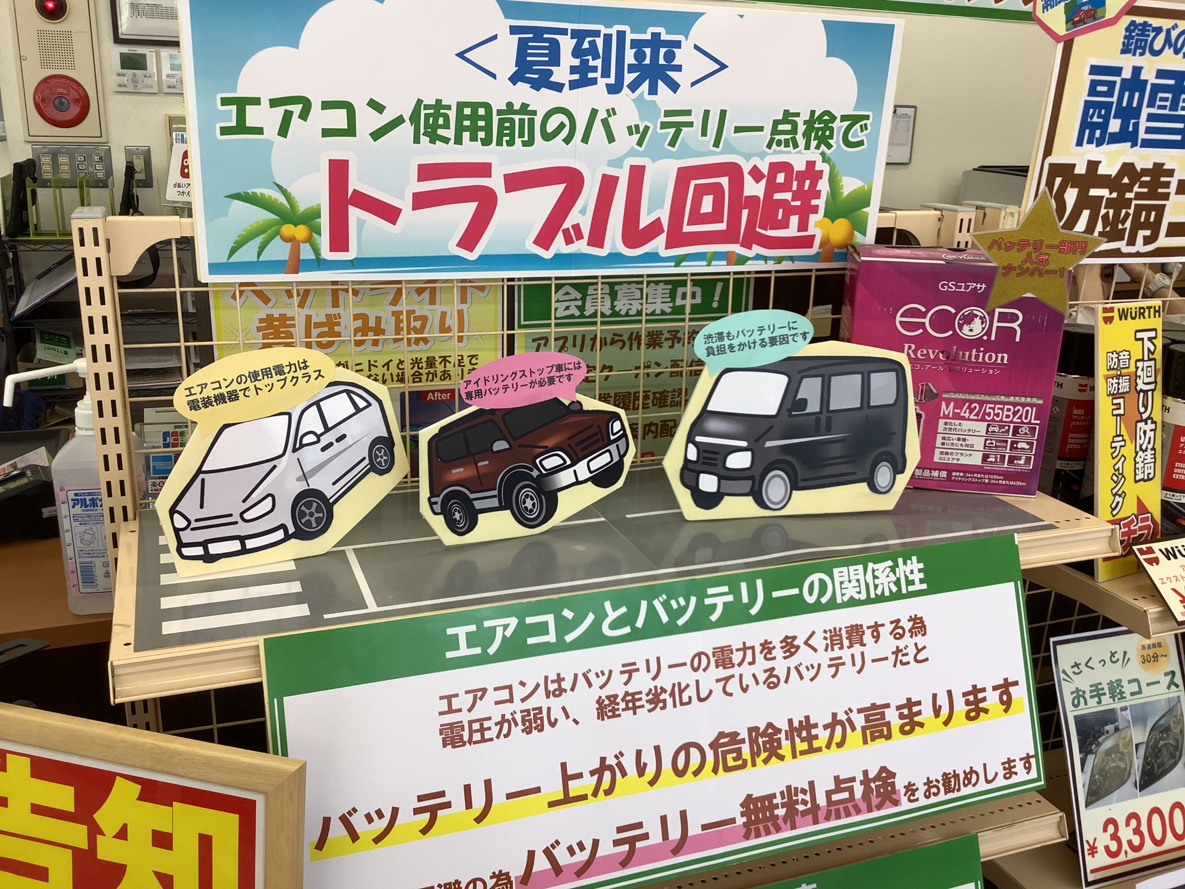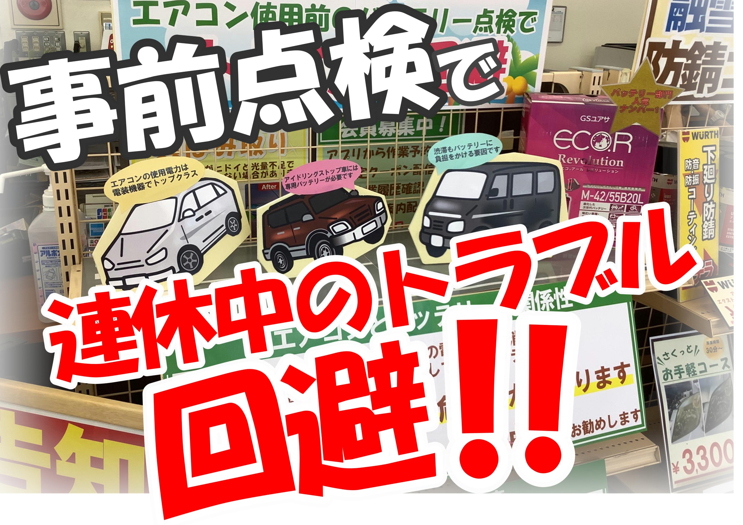バッテリーは急に上がることが多いので事前に点検は必須です