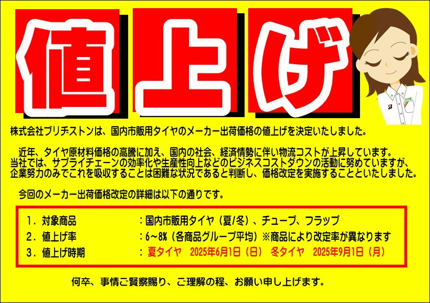 【タイヤ交換】WEBでもお電話でも予約OK! ポスト 2025年3月27日 タイヤ館桑園では タイヤ交換の作業+予約が始まってます!!! 本日は朝からタイヤ交換作業を実施してました! 街乗りがメインの方は交換をオススメします! お持ちの夏タイヤの状態もチェックしてください! 今年はタイヤの値上げ発表ラッシュです。。。 当店でも値上げが決まっております。。。 夏タイヤも冬タイヤも早めの準備が損をしません!!! ご相談だけでもお気軽に!!! タイヤ館 桑園 住所:060-0007北海道札幌市中央区北7条西20丁目2-25 電話番号: 011-613-2525 相談予約 カテゴリ:タイヤ関連 お知らせ