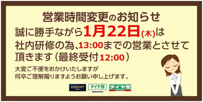 【お知らせ】1月22日(木)の営業時間について