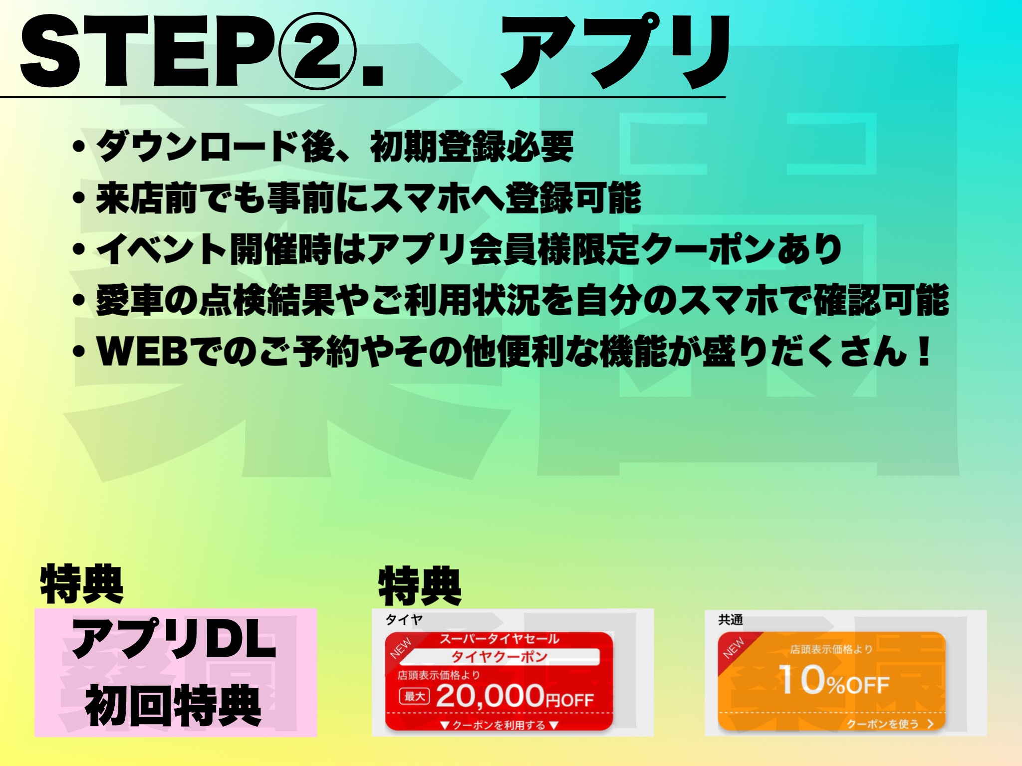 ☑アプリ会員様限定でタイヤ購入時以外にもオイル交換やバッテリー交換などの