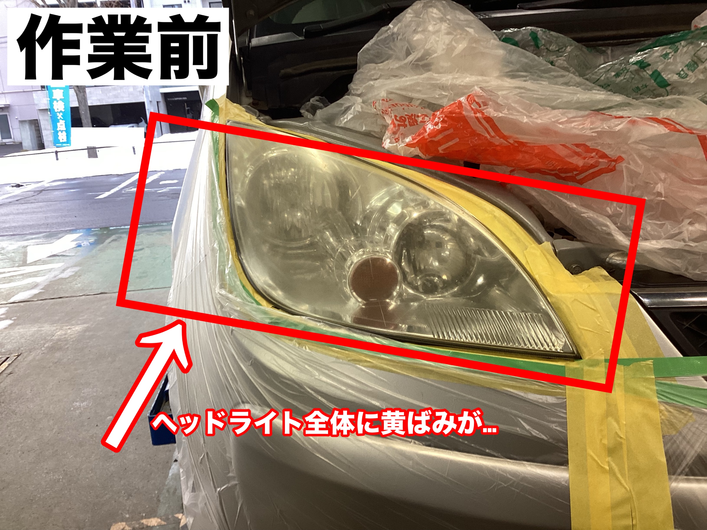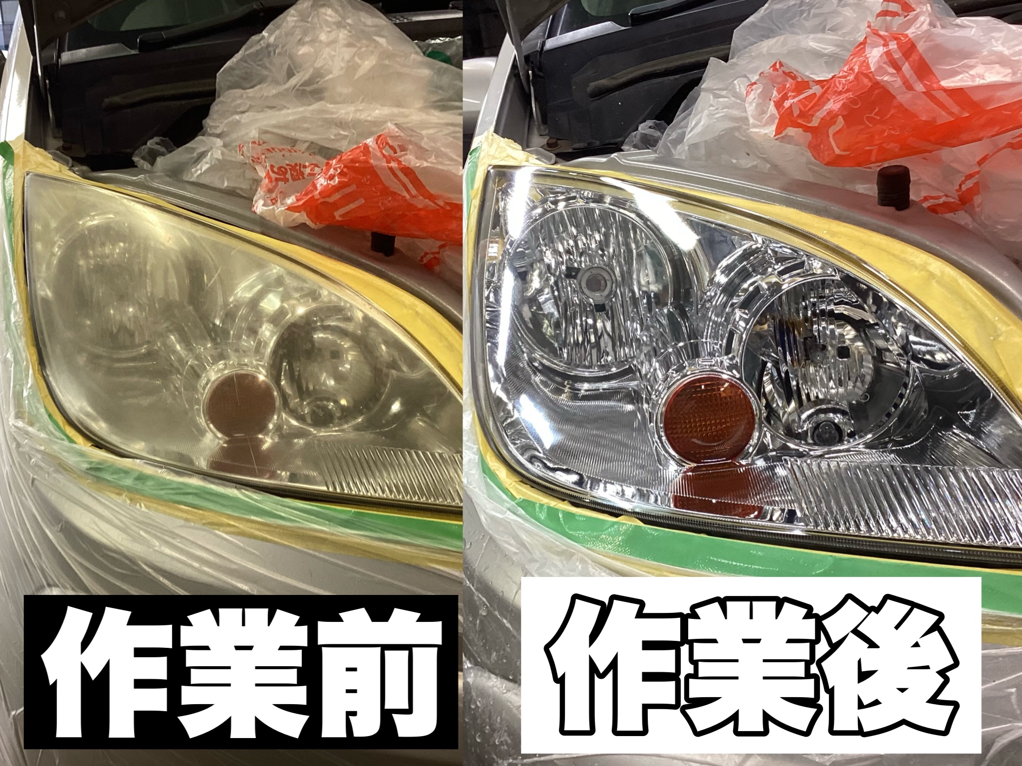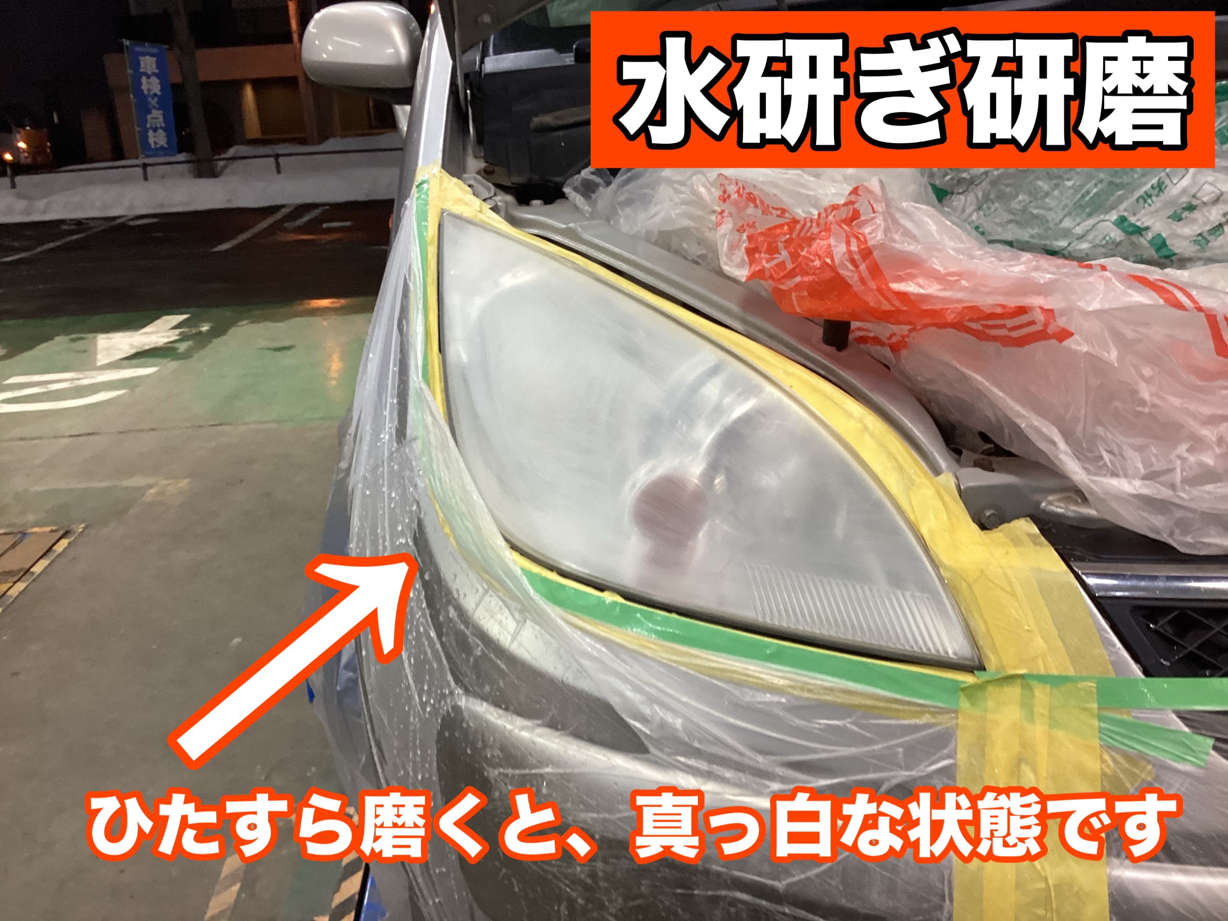 タイヤ館桑園店ではヘッドライトを新品同様まで輝きを取り戻す作業である