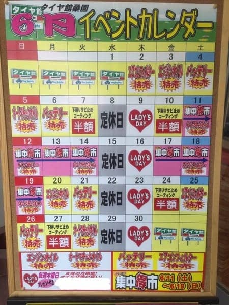 遅くなりましたが、、、 ポスト 2016年6月7日 こんにちは!池田です(゜o゜)お待たせいたしました!!!今月のイベントカレンダーでーす\(^o^)/今週末の売り出し期間中もイベント開催いたします☆お車のメンテナンスをお得にできますよ!是非Checkしてくださいね(^o^)丿明日の水曜日は定休日です。木曜日レディースデーでお待ちしております♪ 担当:池田