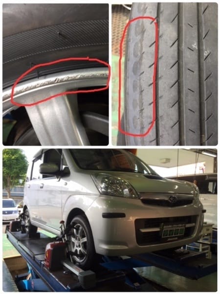 そう!ホイールに傷が付いています!車の骨盤がずれて偏った減り方になってしまっています。