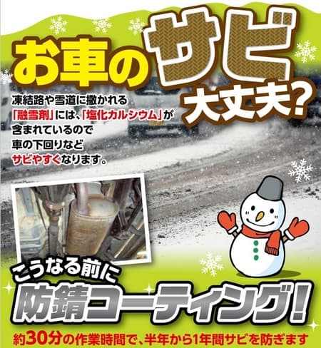 サビ止めしてますか~? ポスト 2016年10月10日 いや~タイヤ交換で大忙しでした。その中でサビ止めの御注文を頂くことが多かったです。北海道の冬道には融雪剤がまかれますよね?この融雪剤が車に与えるダメージは大きいです。皆さんもマイカーの下回りを覗いて見て下さい。錆びている車は要注意!!錆びていない車も予防としてお勧めいたします。皆様のご来店心よりお待ちしております。 担当:えんや