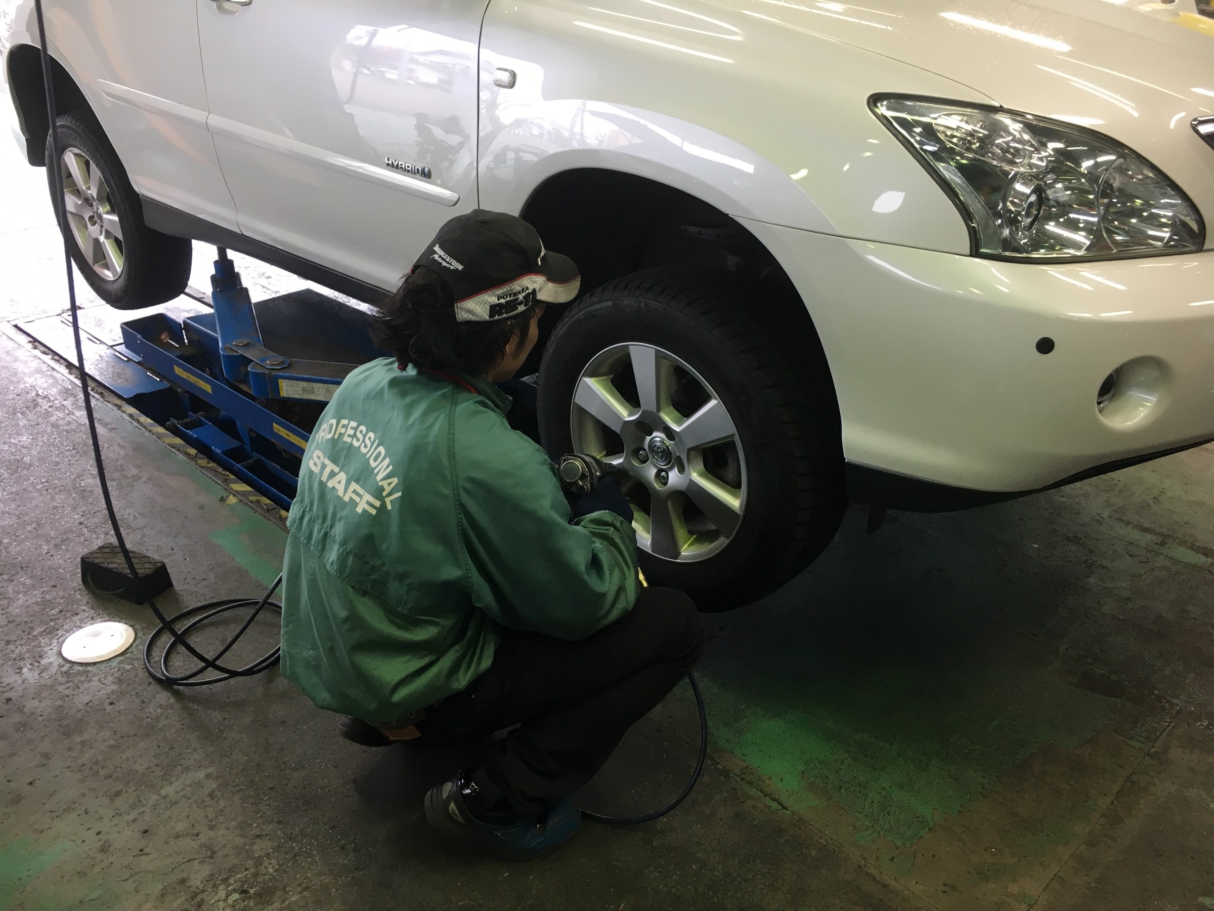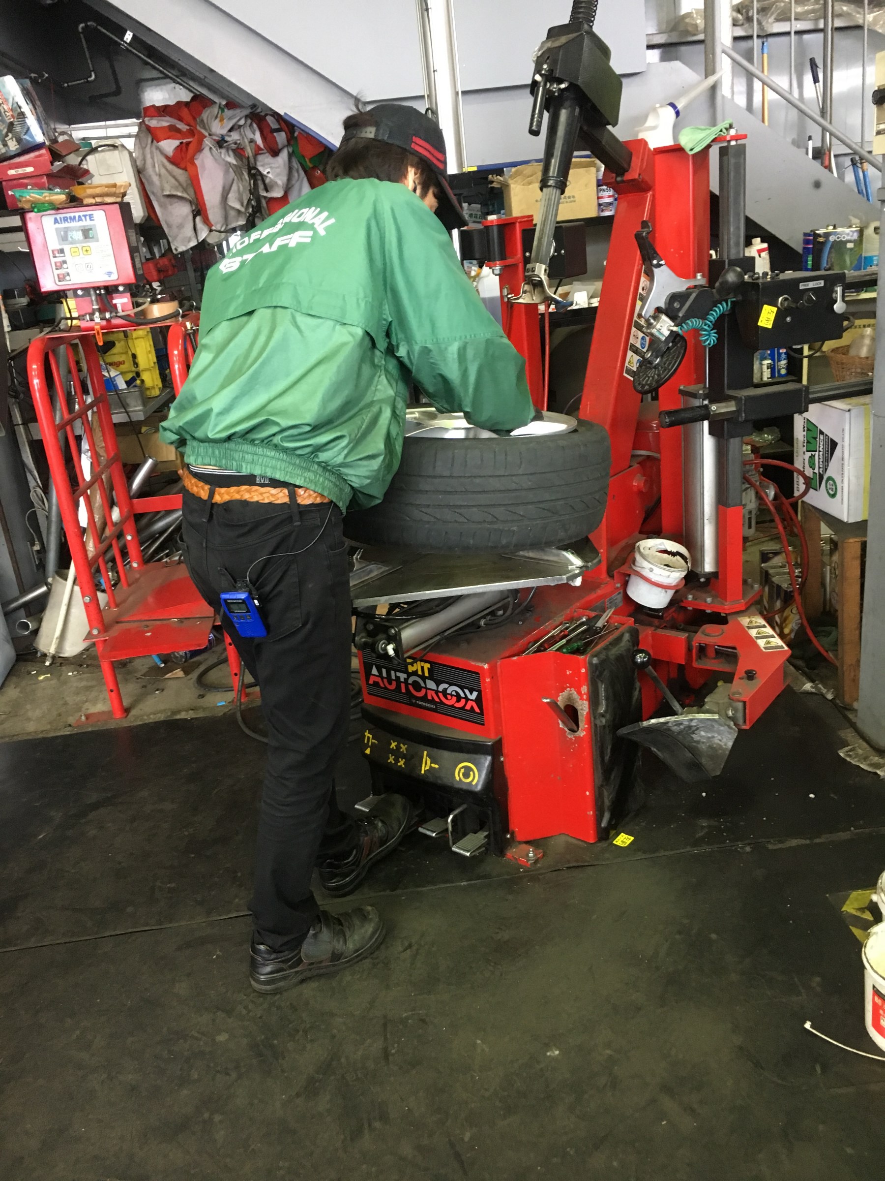 タイヤ組み替え中の細口店長とタイヤ交換中の塩谷スタッフ!
