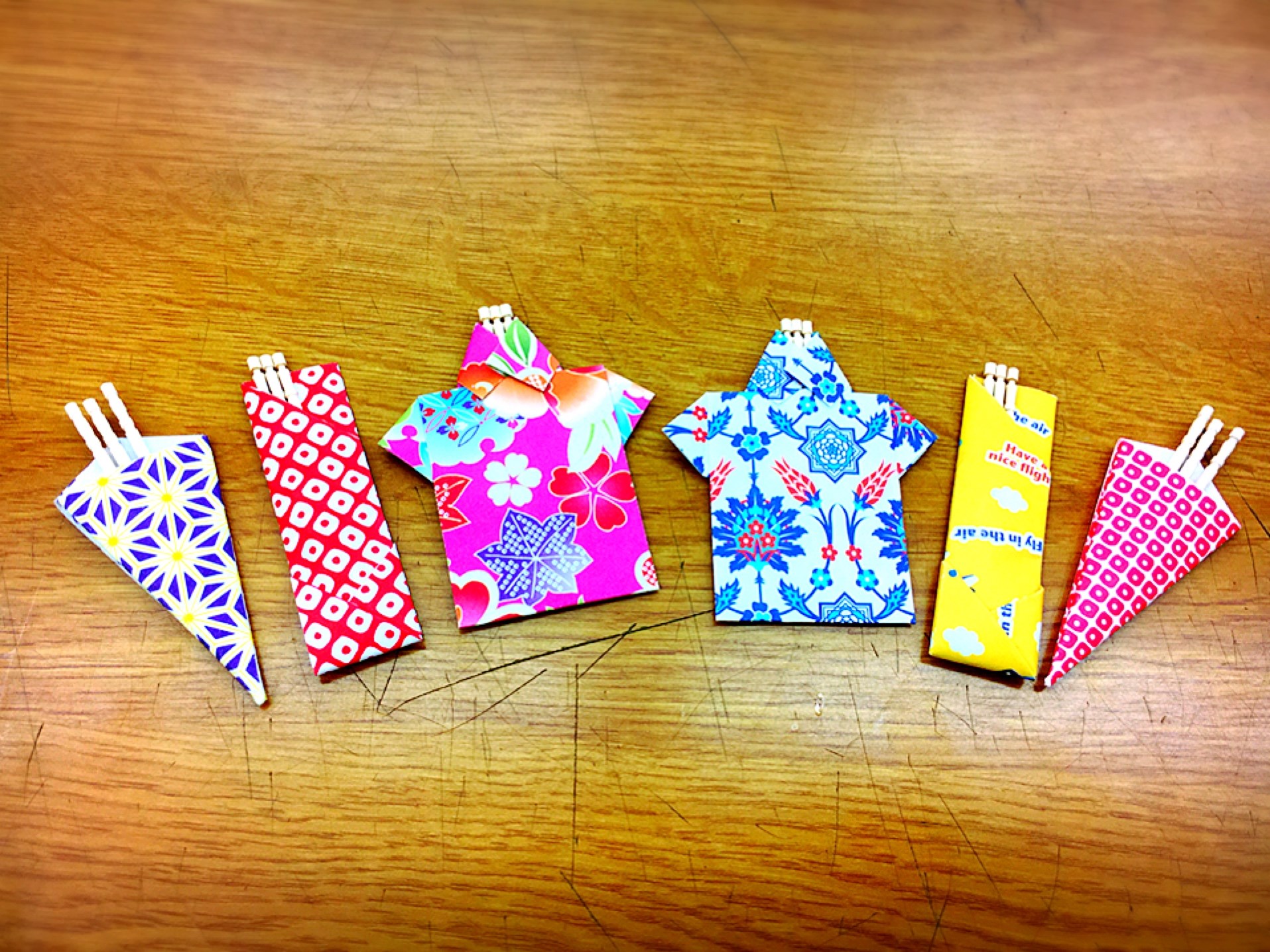 鮮やかな色や模様の折り紙を折ってその中に