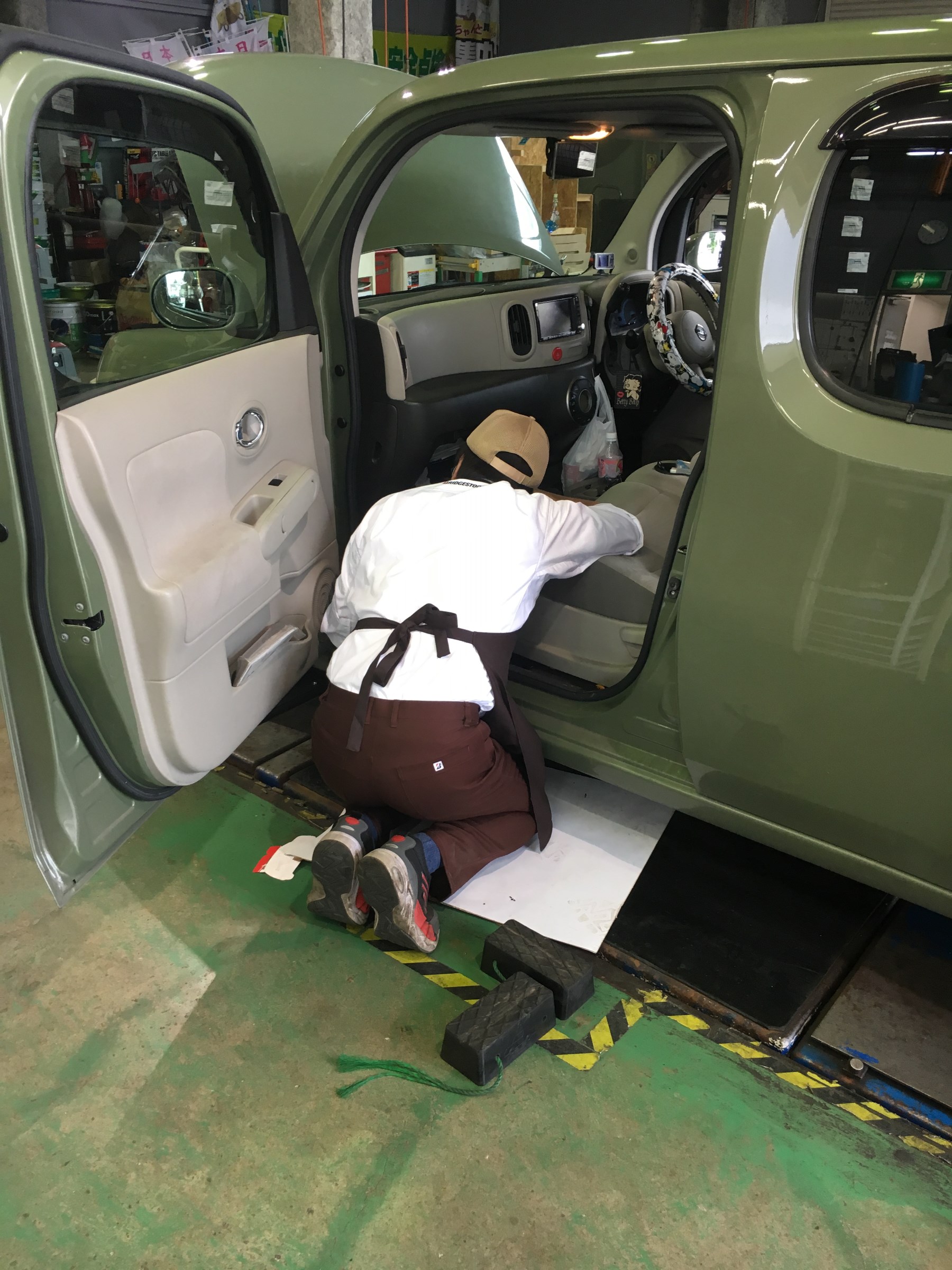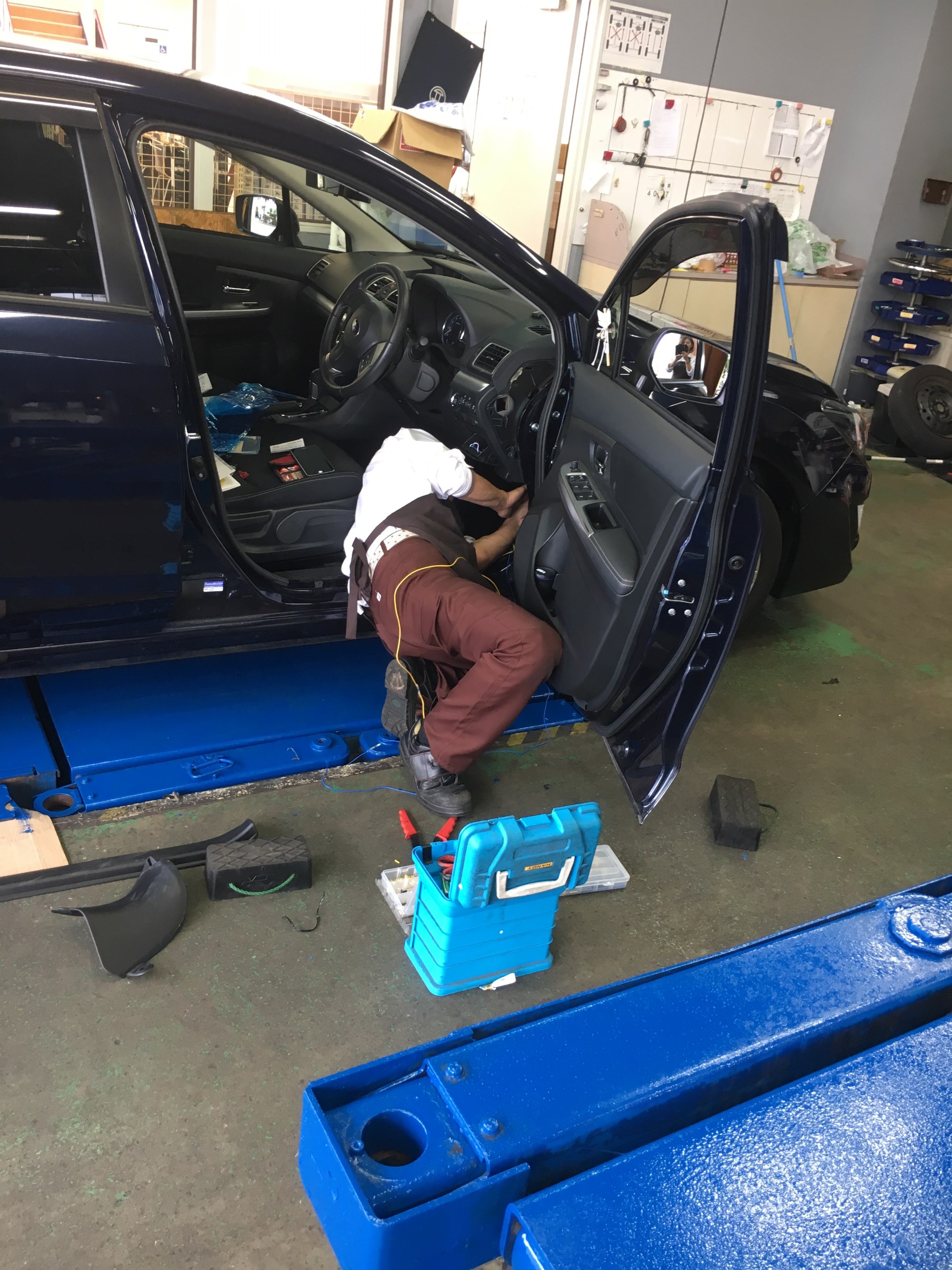 細口店長はエンジンスターターの取付・立崎スタッフはエアコンフィルターの交換、