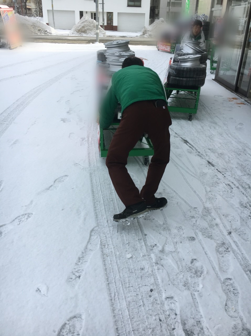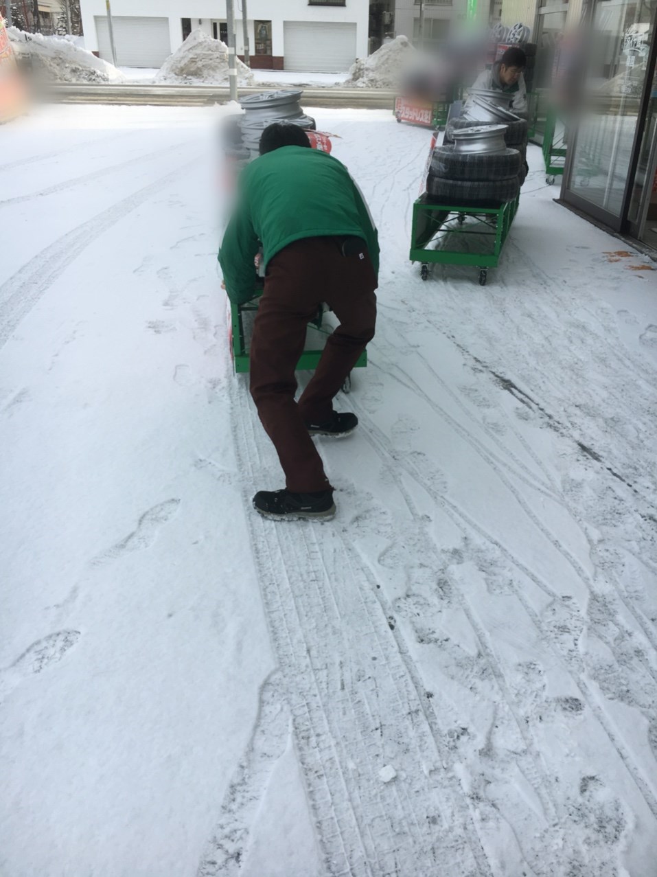 今日の朝道がつるつるで、展示のタイヤを運ぶのも