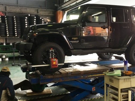 こちらのラングラーはアライメント実施のため入庫です。
