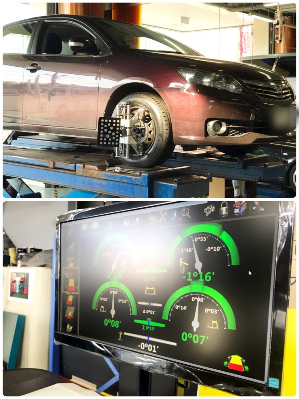 (接地面の偏り)と数値で確認し、純正の正しい数値に戻してあげる作業です。