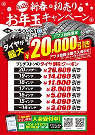 旧年中はコクピット・タイヤ館をご利用いただき、誠にありがとうございました。 本年もお客様の安全・安心なカーライフの為、一層努力してまいりますので、 引き続き宜しくお願い申し上げます。 いつもコクピット・タイヤ館をご愛顧いただいているアプリ会員様限定で 新春初売りお年玉キャンペーン...