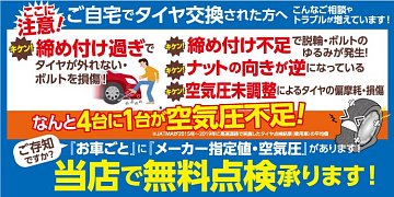 もうすぐ、「ゴールデンウィーク」ですね。 たくさんの方がお出かけになるゴールデンウィークは特に、タイヤやおクルマのトラブルが急増しがちです。 例年、高速道路などでの「タイヤの空気圧不足」によるトラブルが増加する傾向ですので お出かけ前に、しっかり「タイヤ点検」をして備えましょう!...