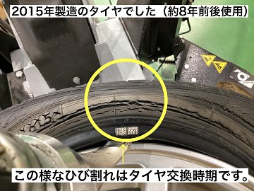 タイヤ館草加インター店のホームページをご覧の皆様こんにちは♪いつもご覧いただきありがとうございます!!タイヤ館草加インター店の細井です。 今日はタイヤのひび割れについてのご紹介です! タイヤ・・・2015年製造、約8年前後使用 タイヤのサイド部の細かいひび割れが気になるとの事でご来店し...