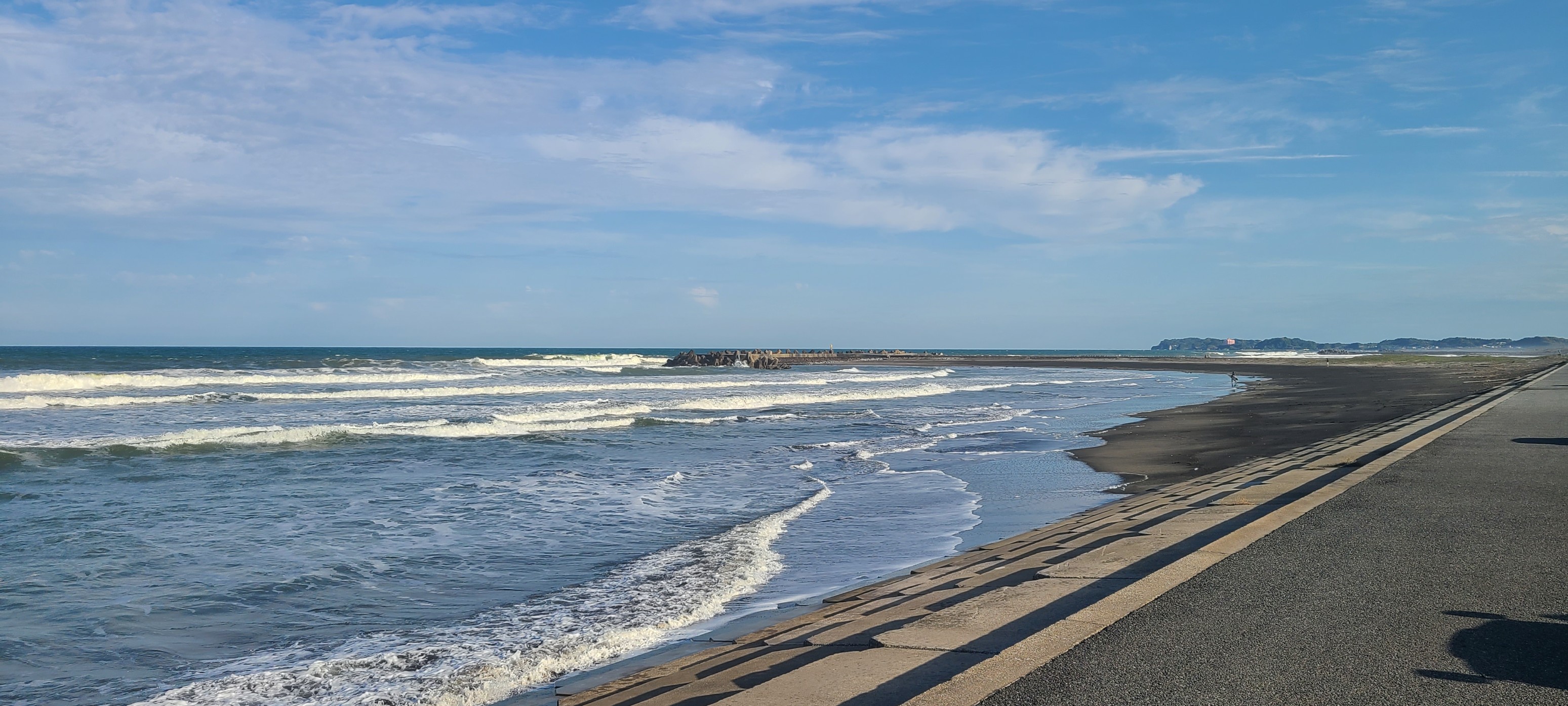 九十九里海岸の砂の多くは銚子、旭にある屛風ヶ浦の崖を波が侵食し、崩れた岩が年月をかけて砂になり九十九里に流れ着いて堆積して海岸を形成すると聞いたことがありますが、近年は海岸の砂の浸食スピードが速くて砂が無くなっているそうです。浸食対策工事も数年かけて行っていましたが、だいぶ無くなっていますね。