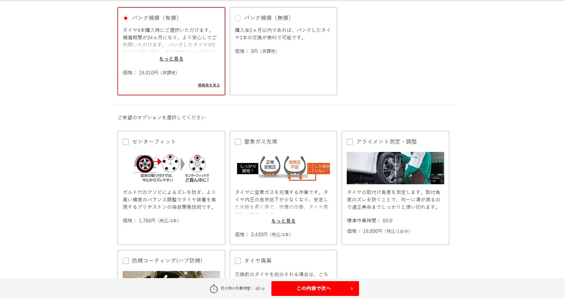 タイヤが選べたら次にパンク補償等のオプションを選択頂けます!こちらもご不明な点ありましたらご相談ください!