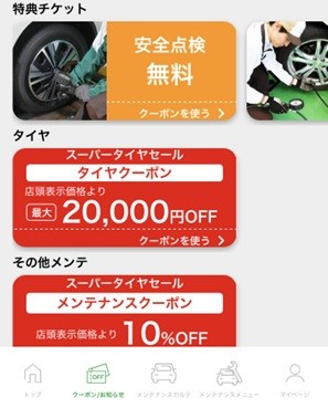 アプリ登録クーポンやスーパータイヤセールクーポンなどお得なクーポンが配信中