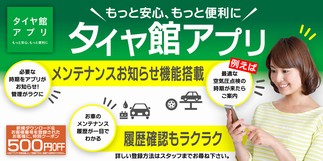 タイヤ館をご利用の際はアプリを確認頂きお得にご利用ください。