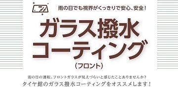 こんにちは! タイヤ館吹田店です いつもHPをご覧頂きありがとうございますᕱ⑅ᕱ゙ 本日は!! ☆ガラス撥水のご案内☆ 最近雨の日が多いですね(´;ω;`) そんな時!! 雨の日に外が見えにくいなど 感じたことございませんか? 気になる方には! 〖ガラス撥水コーティング〗をおすすめ致します(*ฅ́˘ฅ̀*) ...