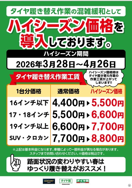 コクピット・タイヤ館は“平日”がお得!『平日割』実施中!