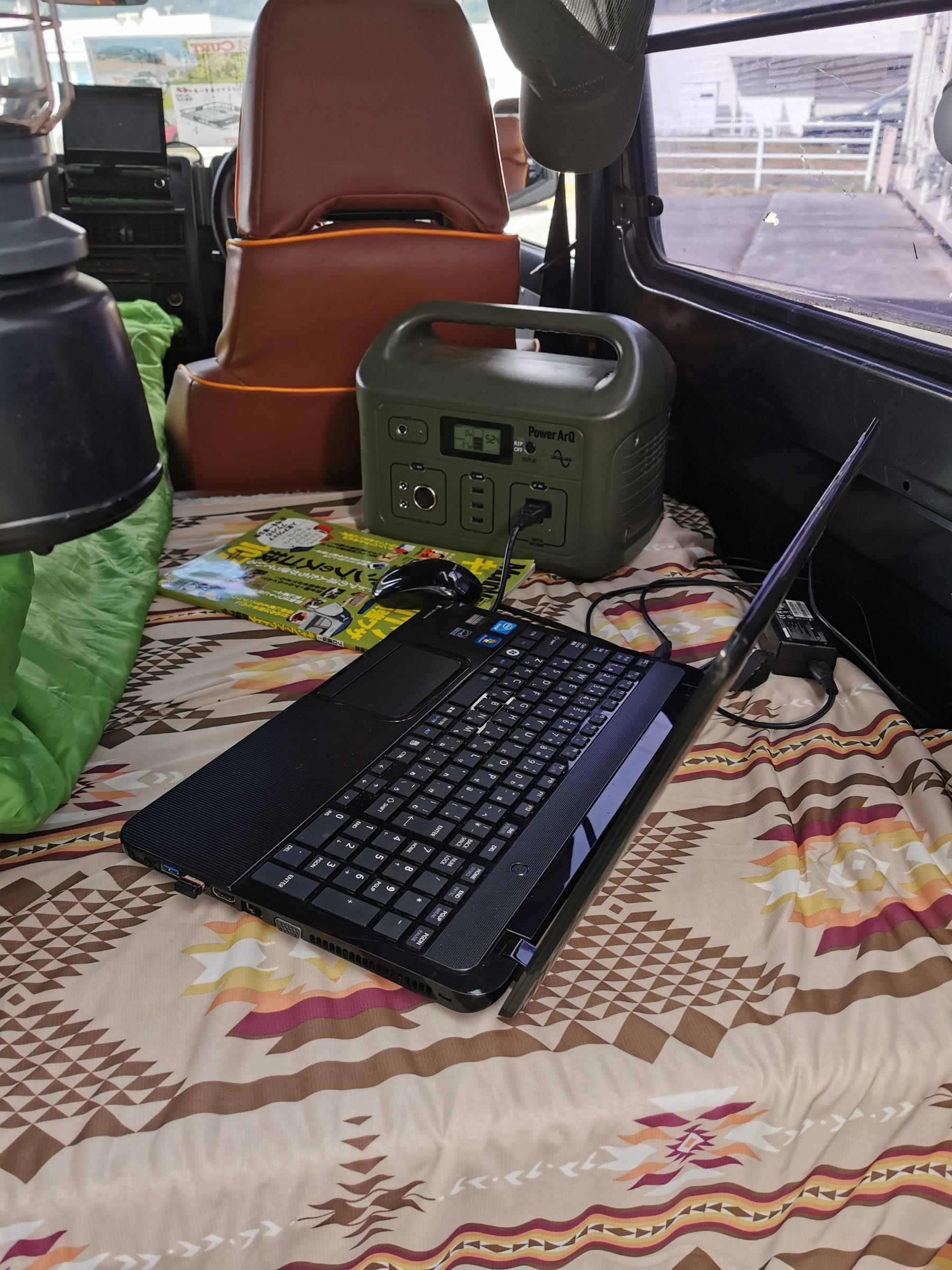 車内ではポータブル電源をつないでパソコンや携帯の充電もOK! 扇風機も32型テレビもOK!