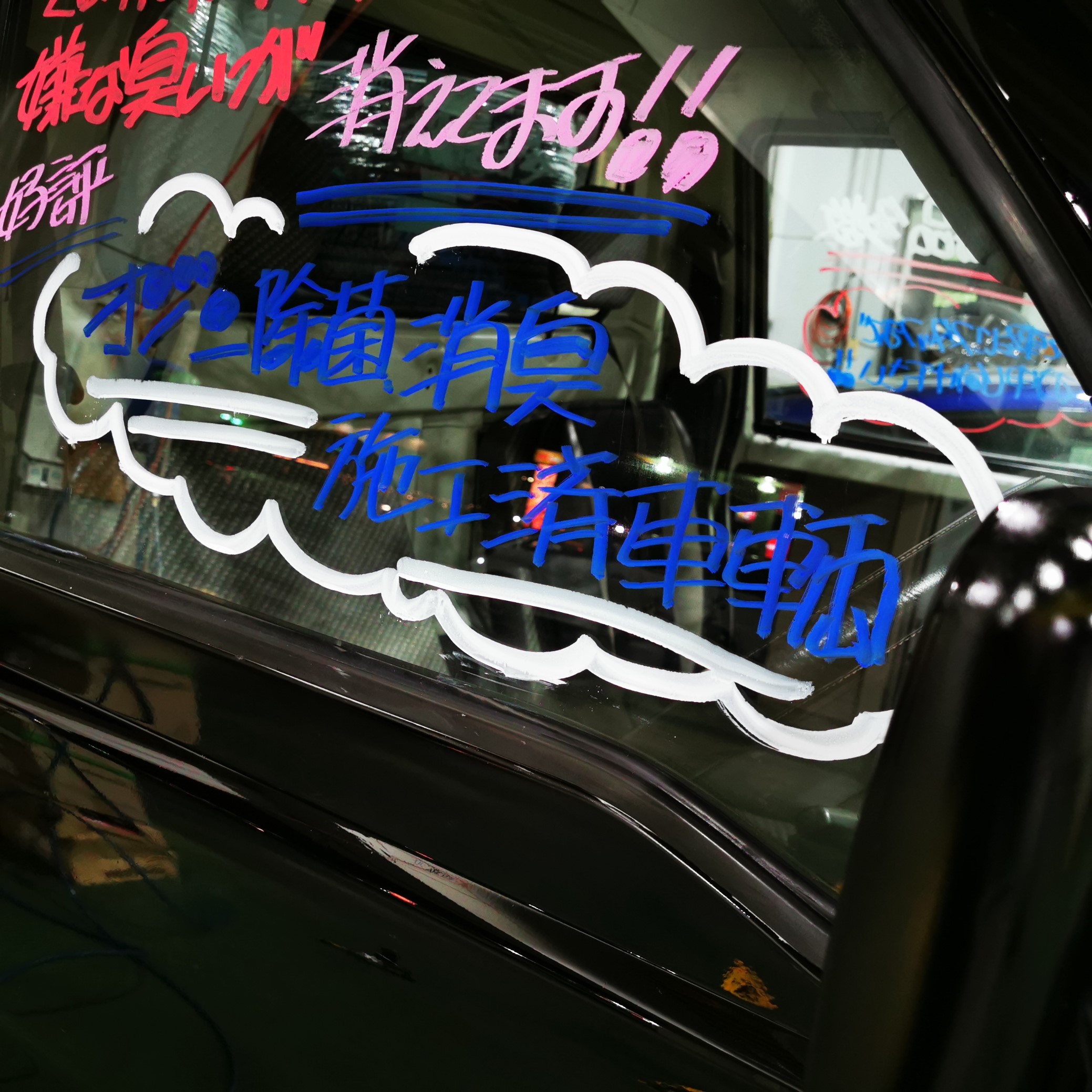 施工後は、驚くぐらい爽やかです!!! 宣伝の為にガラス全面におススメポイントを書き込みました!