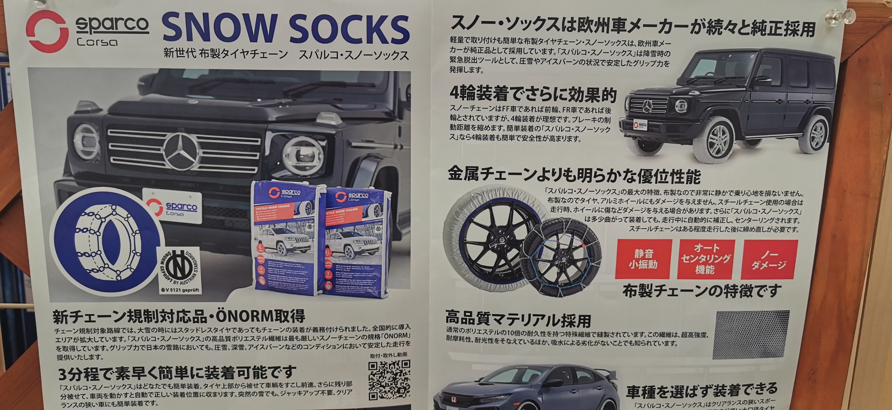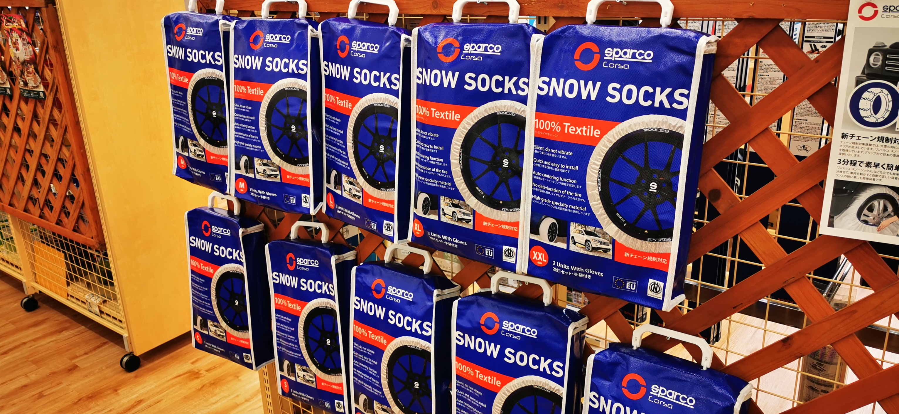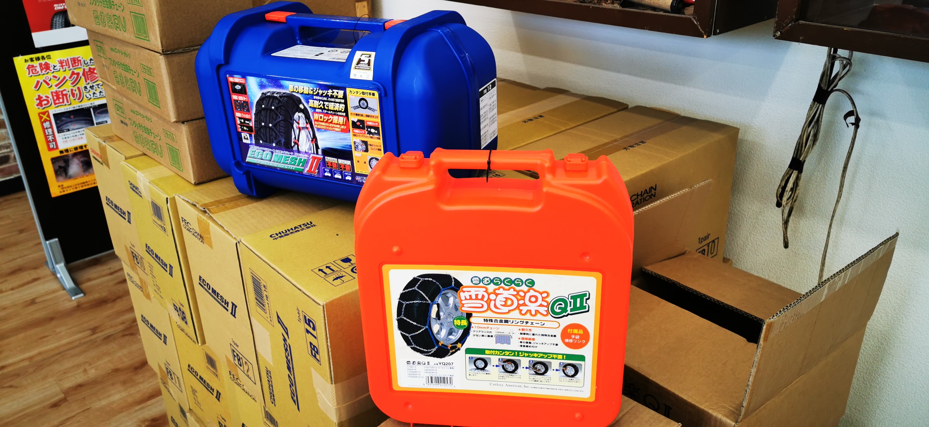 今年も降雪に備えタイヤチェーンが入荷しました! 今年より布タイプの「スノーソックス」も準備させて頂きました。