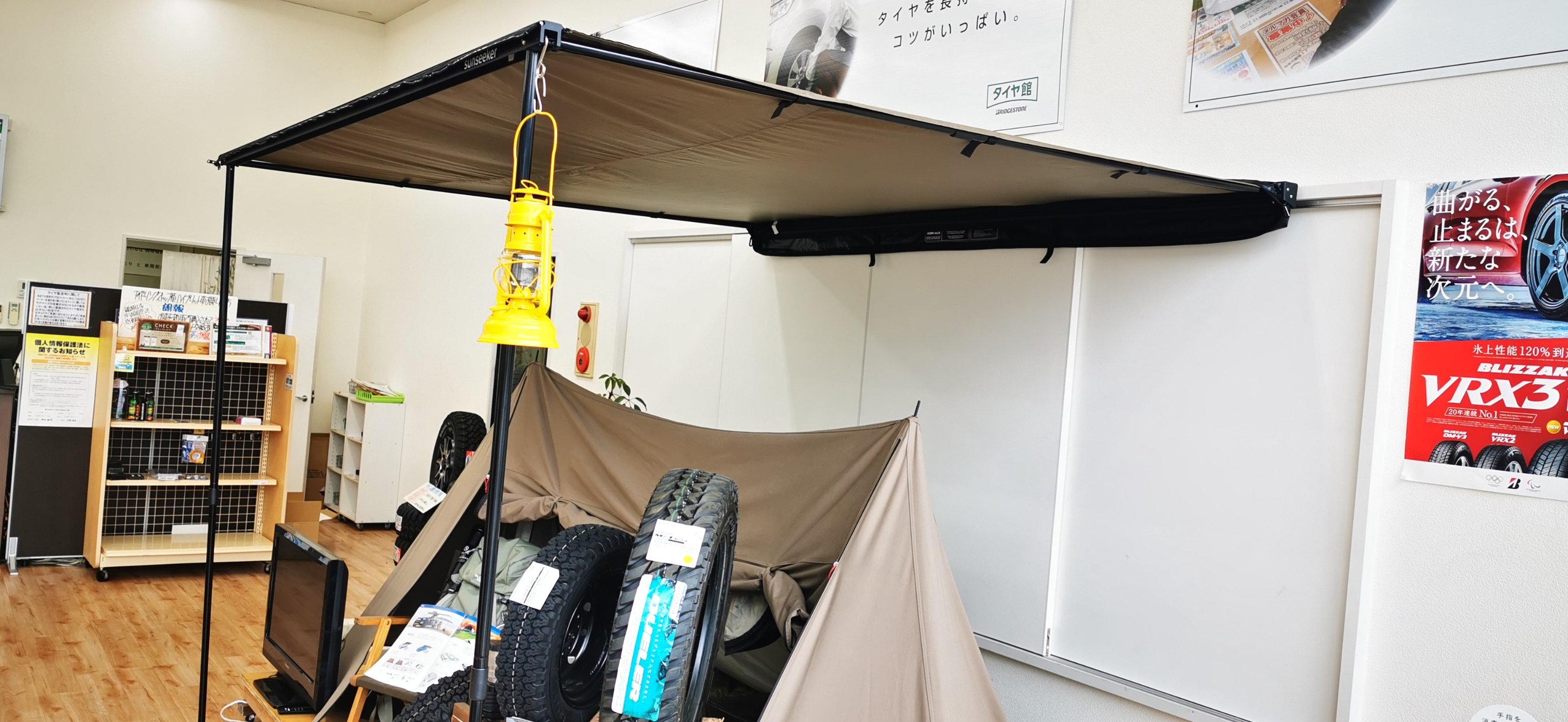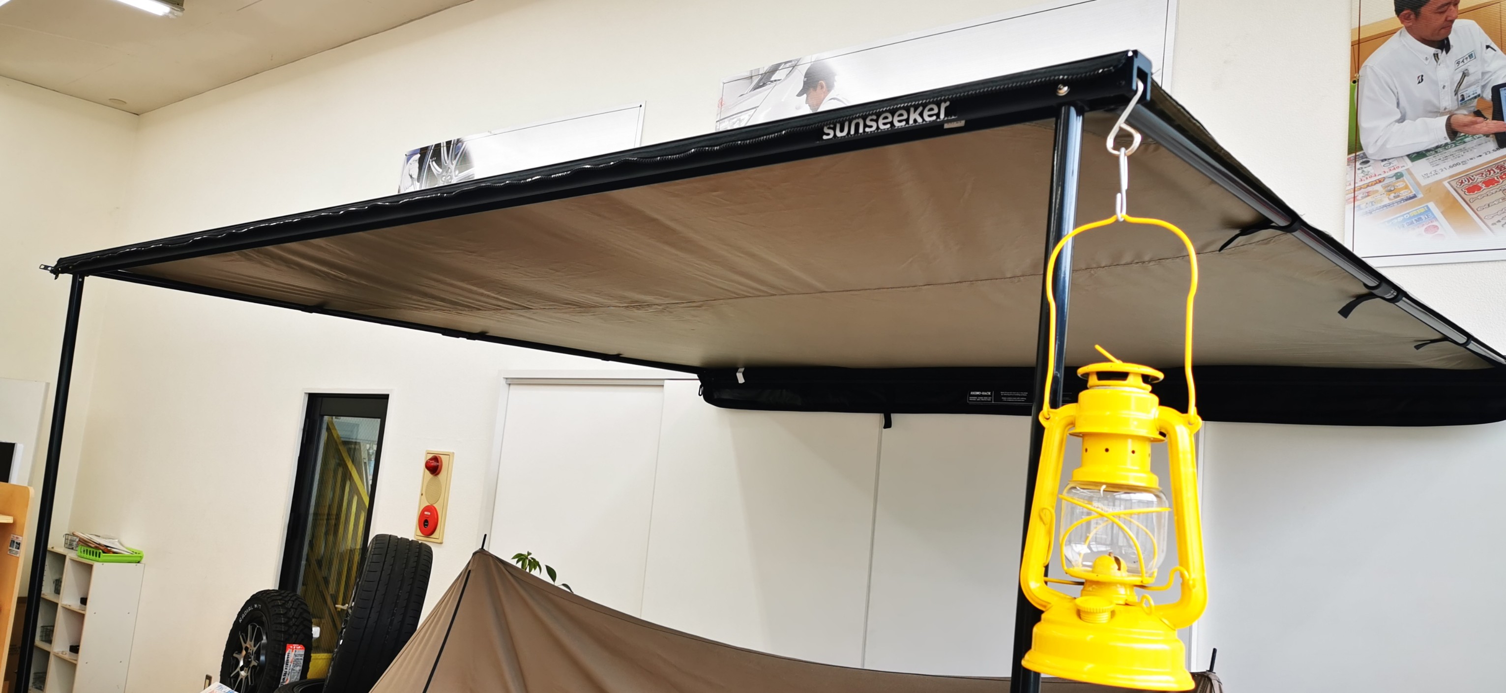 以前は天気の良い日にサイドタープを取り付けたデモカーで展示していましたが、現在は、店内で拝見出来る様に店内展示しています。