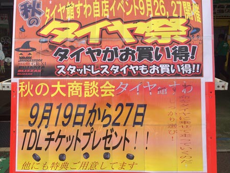 大商談会、自店イベント ポスト 2015年9月13日 長雨が続き諏訪も涼しくなってきましたて事で今月もやりますタイヤ大商談会とタイヤ館すわ自店イベント(^_^)/ノーマルタイヤもそうですけれどスダッドレスも早期予約でお求めやすい価格になっています特典もあります、詳しくは店頭にて(^_^)開催期間、商談会9月19日~27日自店イベント9月26日、27日ご来店お待ちしてます