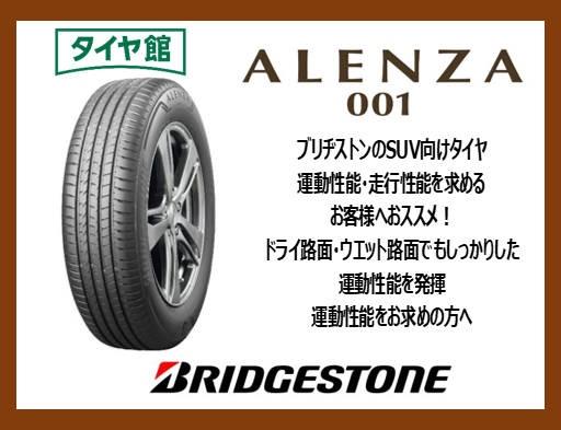 ALENZA 001 ポスト ◎タイヤほぼ3行紹介◎ ①SUV専用タイヤ! ②SUVのポテンザ的存在! ③キビキビ・しっかりした乗り心地! 【総評価】運転を楽しみたいSUVユーザーの方にオススメ! 関連情報もあわせてご覧ください ブリヂストンタイヤサイト カテゴリ:商品情報 タイヤ関連
