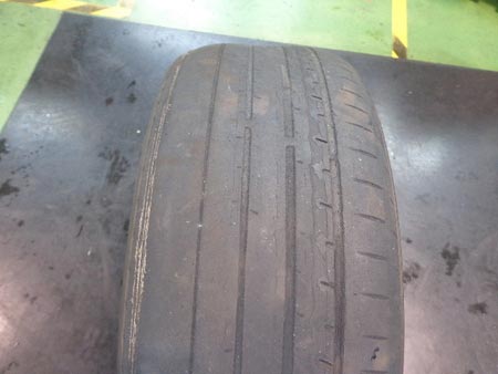 さらに写真のようにタイヤの内側がだいぶすり減って、内べりしていましたのでアライメント調整をして頂きました。