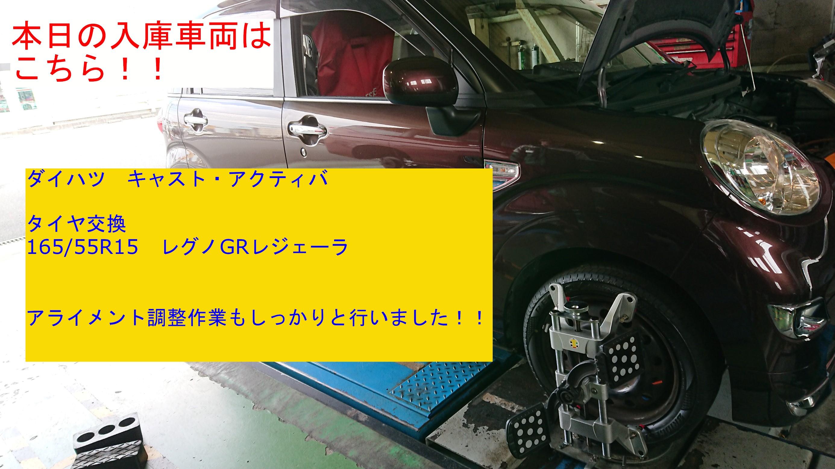 【ダイハツ・キャスト アクティバ】タイヤ交換+アライメント調整作業のご紹介です