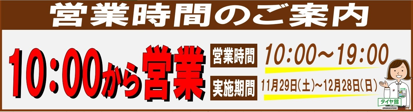 いつもタイヤ館平をご利用頂きありがとうございます! 2025年11月29日(土)~12月28日(日) 営業時間変更のお知らせです。 通常10:30~19:00の営業ですが、 上記の期間、10:00~の営業開始となります。 何卒よろしくお願い申し上げます。 タイヤ館平