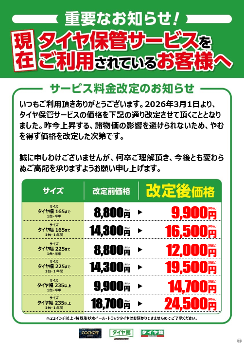タイヤ保管(クローク)金額値上がりのお知らせ