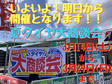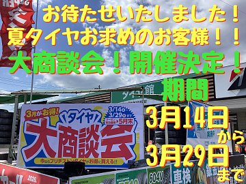 皆さんこんにちは! 少しずつ、春の訪れを感じるようになってきました!! 暖かくなってくると必要になってくるのが、 ” 夏タイヤ ” です!!! お持ちの夏タイヤ、溝や劣化具合などはいかがでしょうか?? 交換しなくてはいけないお客様!朗報です♪ 大商談会の開催が決定いたしました!!! 開催期...