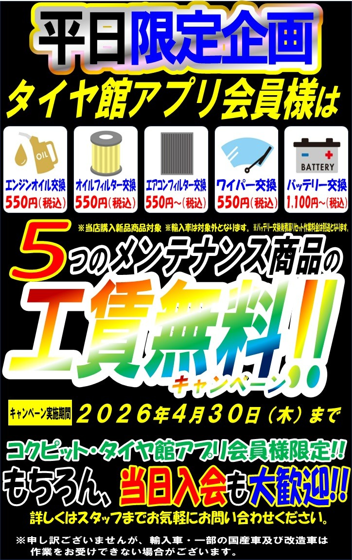 ☆☆平日・アプリ会員限定!メンテナンス工賃無料!