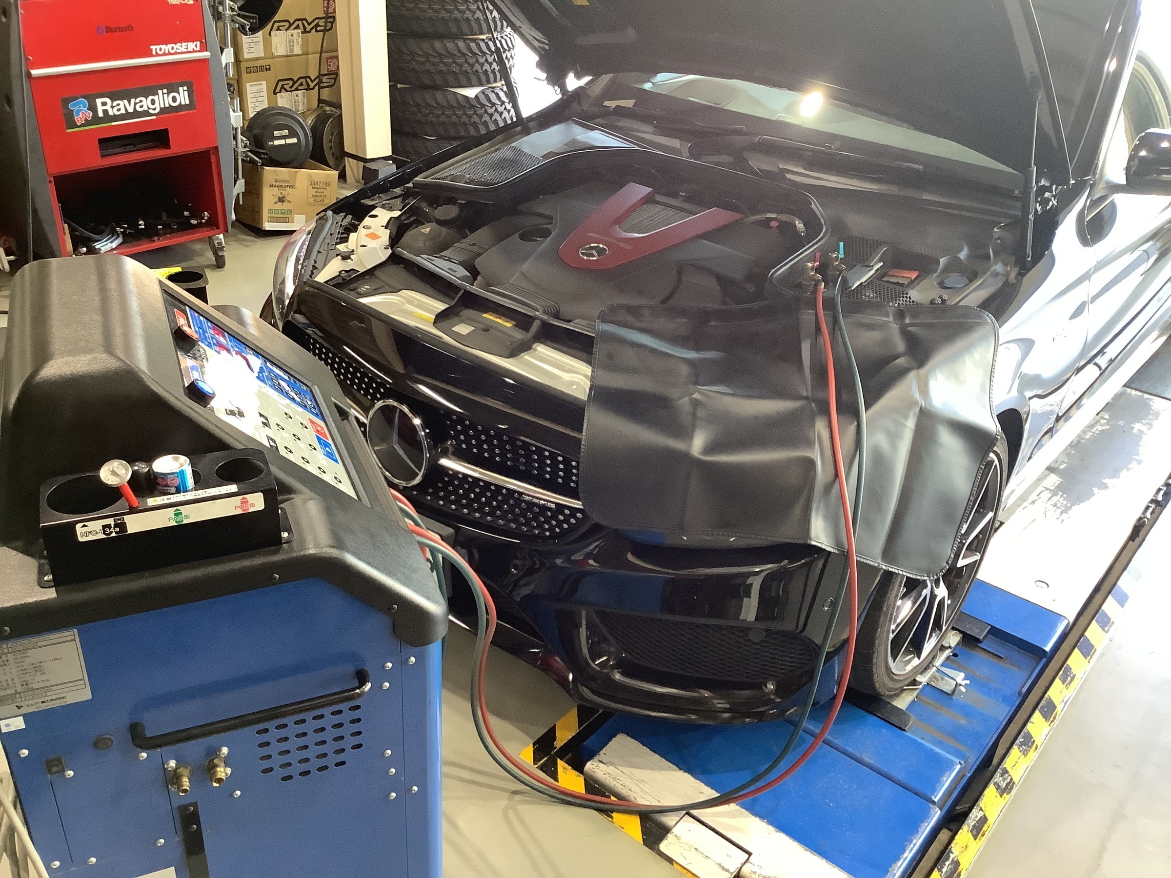エアコンガスの回収と不純物除去、補充。コンプレッサー性能回復によりエアコンシステムの効率アップに繋がり冷えが良くなります。