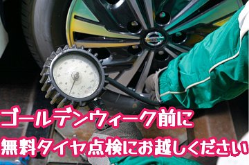 記事一覧 ゴールデンウィーク前に、しっかりタイヤ点検、タイヤ交換をしましょう★新品タイヤは慣らし走行が必要ですので前もって交換しましょう(・∀・) 無料タイヤ点検、スーパータイヤセールでお得にタイヤ交換をしませんか? 新品のタイヤは表面に保護剤の膜がついており、本来のグリップ力を発揮するには「慣らし」が必要です。 夏用タイヤは、80km/h以下で 100km以上走行。 急ハンドル、急ブレーキ、急加速は避けて下さい。 一皮むけた後、本来の... 2026年4月18日 ポスト