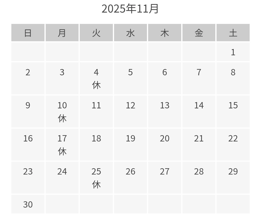 11月 定休日のお知らせ 2025年10月28日 いつも当店をご利用いただきありがとうございます。 11月定休日のお知らせです。 11月は、 4日(火) 10日(月) 17日(月) 25日(火) となります。 ご来店の際にはお気をつけください。 皆様のご来店お待ちしております。