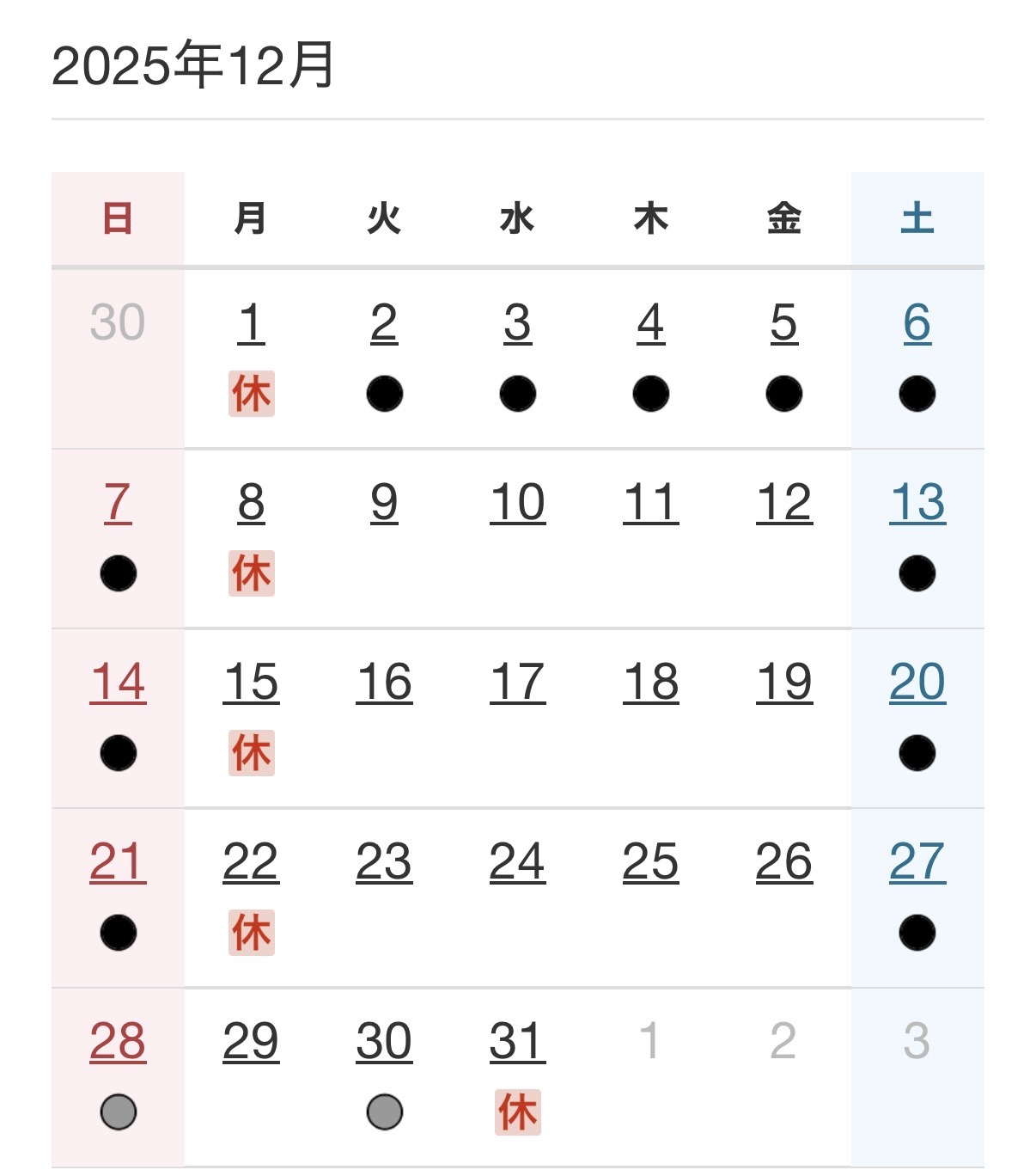 12月 定休日のお知らせ 2025年11月29日 いつも当店をご利用いただきありがとうございます。 12月の定休日のお知らせです。 12月は 1日(月) 8日(月) 15日(月) 22日(月) 31日(水) がお休みとなります。 お間違えのないようお気をつけください。 また、この時期は冬タイヤへの履き替えで大変混み合っております。 すでに12月も作業予約が埋まってきているため、作業のご予約はお早めにお願い致します。 皆様のご来店お待ちしております。