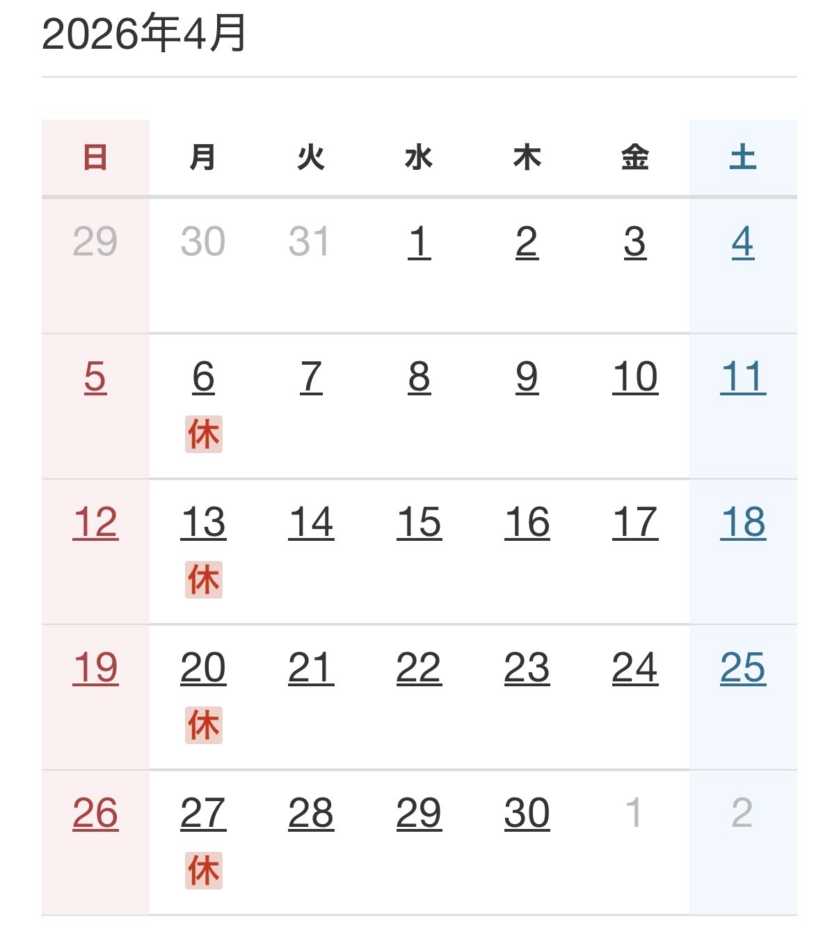 4月 定休日のお知らせ 2026年3月25日 いつも当店をご利用いただきありがとうございます。 4月の定休日のお知らせです。 4月は 6日(月) 13日(月) 20日(月) 27日(月) が定休日となります。 お間違えのないようご注意ください。 皆様のご来店お待ちしております。