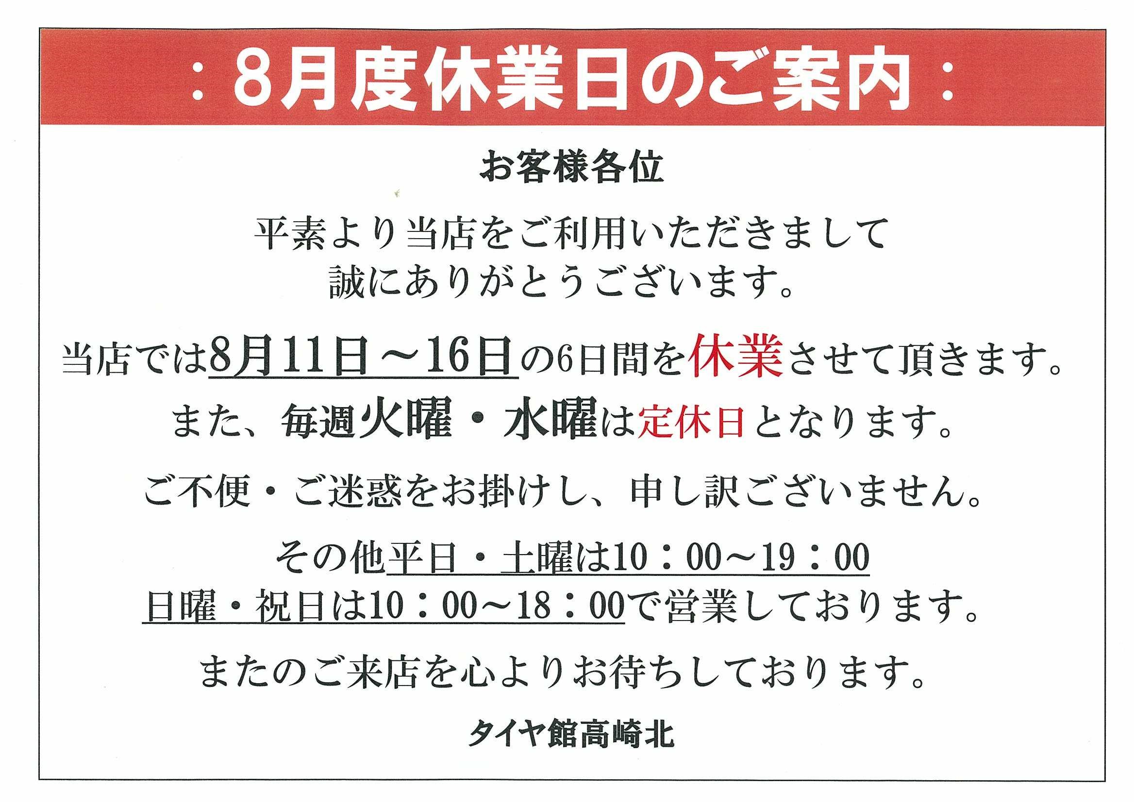 タイヤ館高崎北の連休中の営業は8月10日(月・祝)18時までです。