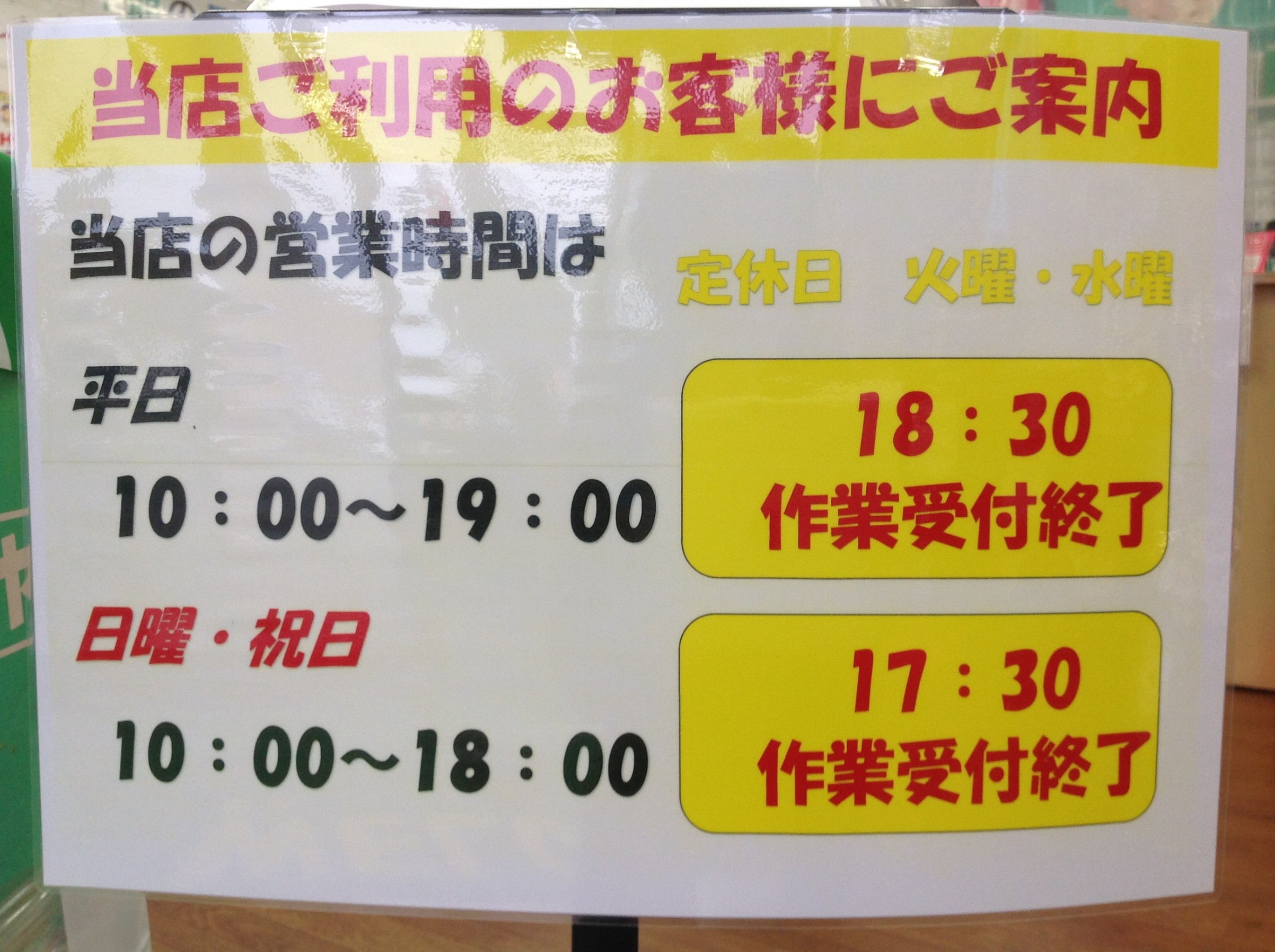 平日、休日共に作業受付終了時間を解りやすく表示させて頂きましたので来店の際にご確認くださいませ。
