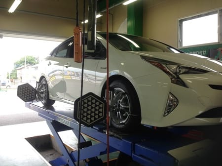 アライメント作業 ポスト 2016年7月31日 先日は、新型プリウスのアライメント作業がありました。アライメントは写真のようにタイヤに器具を取り付けて行います。最近はありがたいことにアライメントに関するお問い合わせも増えてきているように思います。お車によっては作業できないこともありますので、ご了承ください。ですが、できる限りご要望にお応えしていきたいと思いますので、お気軽にご相談ください!