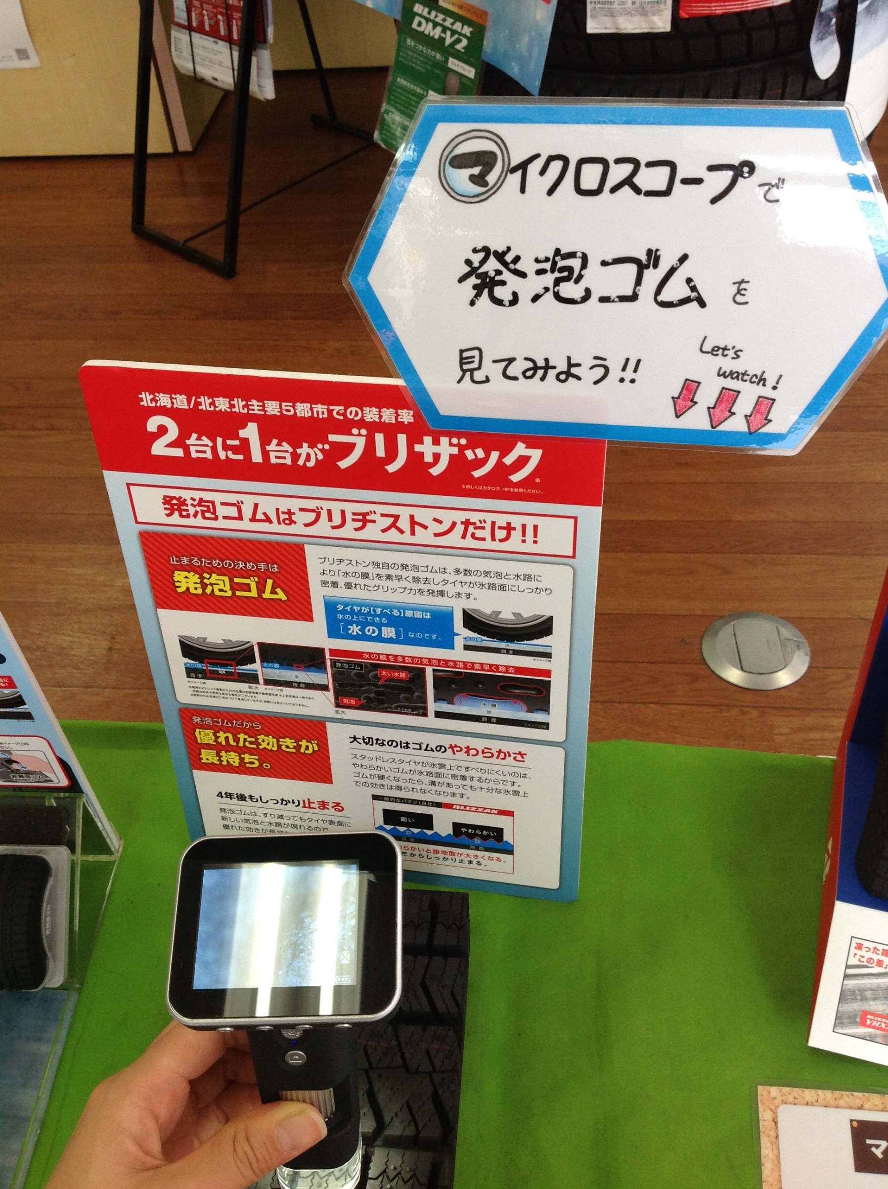 マイクロスコーーーープ! ポスト 2018年10月8日 今月のおすすめ(と言いつつ冬季のおすすめ)紹介!! 冬の必需品といえば、ズバリ スタッドレスタイヤ❄ですね~! タイヤ館高崎北の一押しはBLIZZAK✩ こちらではブリヂストンの特徴である 発泡ゴムを実際に見ることができます(人◕ω◕) マイクロスコープで拡大してみましょう! 光が反射して見えないですね…汗 ということで当店にてご覧くださいm(_ _)m 担当:宮澤