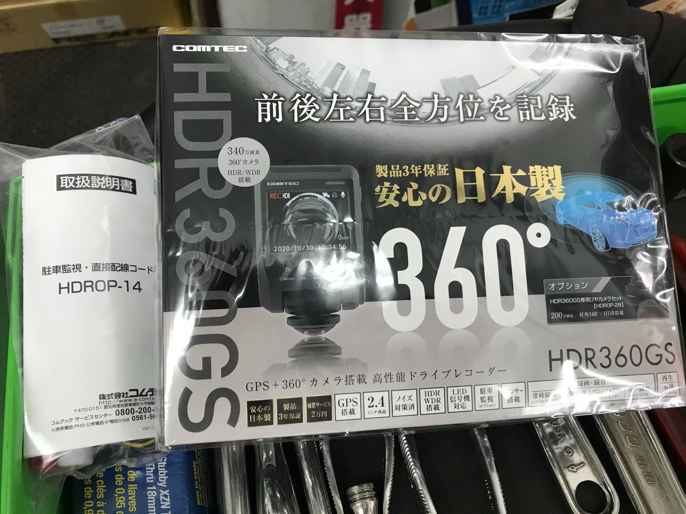 今回はコムテックさんのHDR360GS。全方位記録の360°カメラ搭載モデルです。