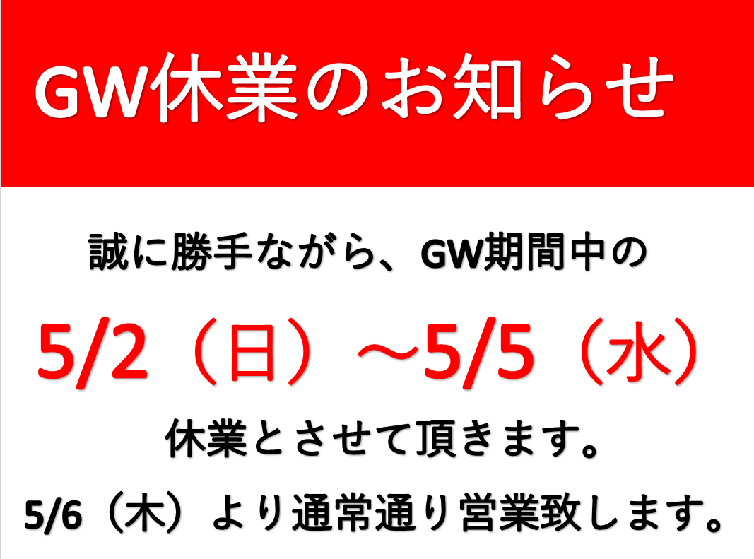 GW休業のお知らせ ポスト 2021年5月1日 いつもタイヤ館 高島平をご利用頂き誠にありがとうございます。 早速ですが、明日5/2(日)~5/5(水)までの期間、GW休業とさせていただきます。 5/6(木)より通常営業致します。 皆様には大変ご迷惑をお掛け致しますが、何卒よろしくお願い致します。 担当:フナミズ